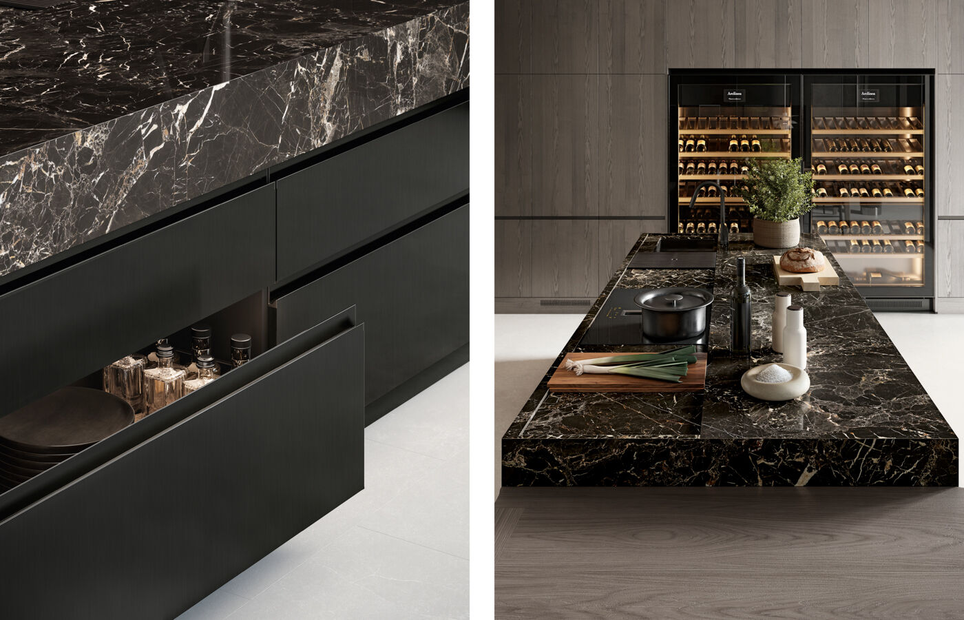 Work island with worktop in 20 cm thick polished Black Saint Laurent marble, with drip guard on all sides allowing for more freedom when cooking food and using water: a detail that transforms preparation into ease of use. In the centre of the wall of tall units, the refrigerated dual-temperature wine unit Vina. This page, detail of deep drawers with internal drawers, sides and black front, and Moka Box accessories: perfect in combination with Convivium Elegant door in black PVD stainless steel.