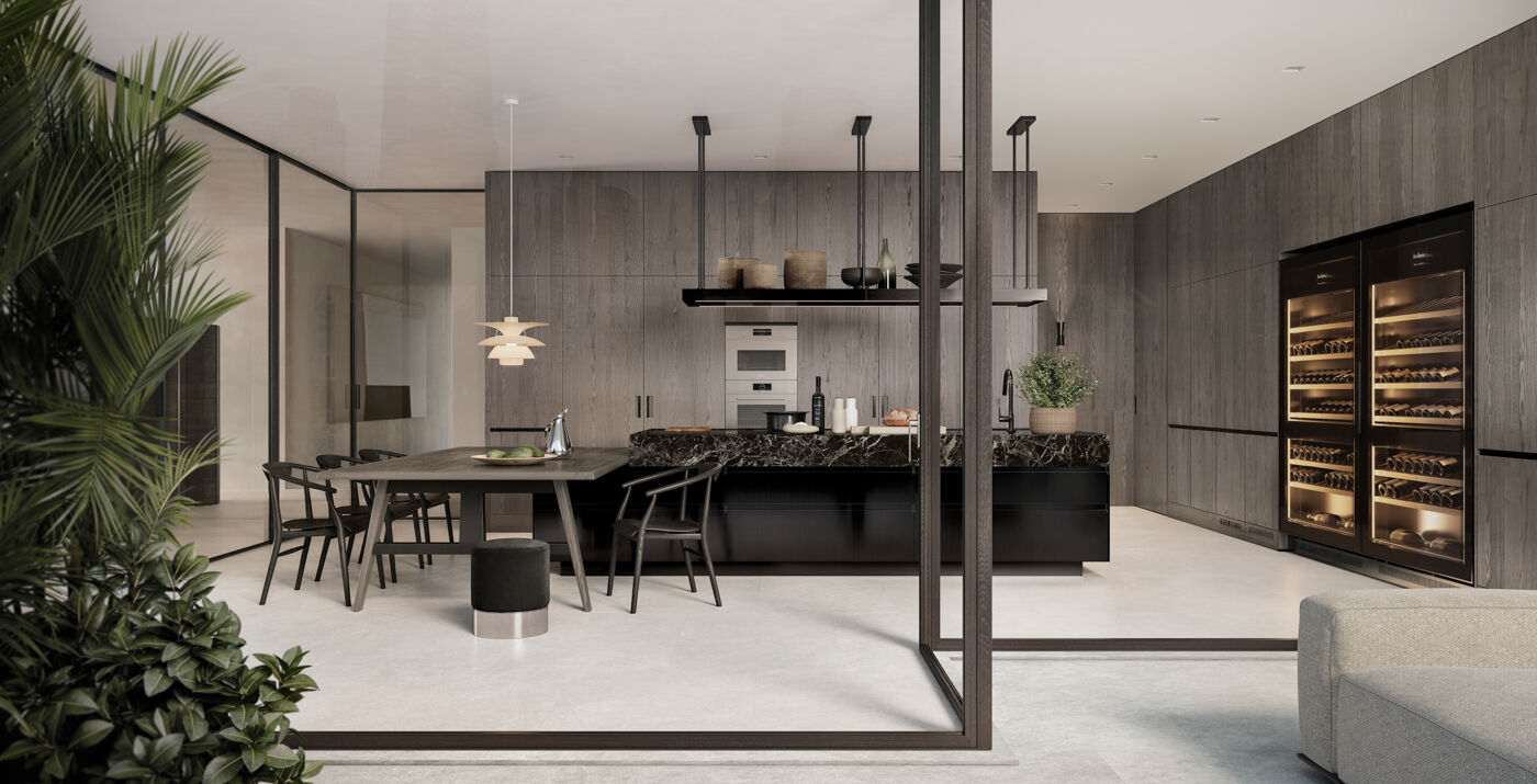 The large panelled wall, housing, in the centre, the refrigerated dual-temperature wine unit Vina, links seamlessly with the wall behind the island, hiding access to the Wet Kitchen, through the floor-to-ceiling Frame System door.